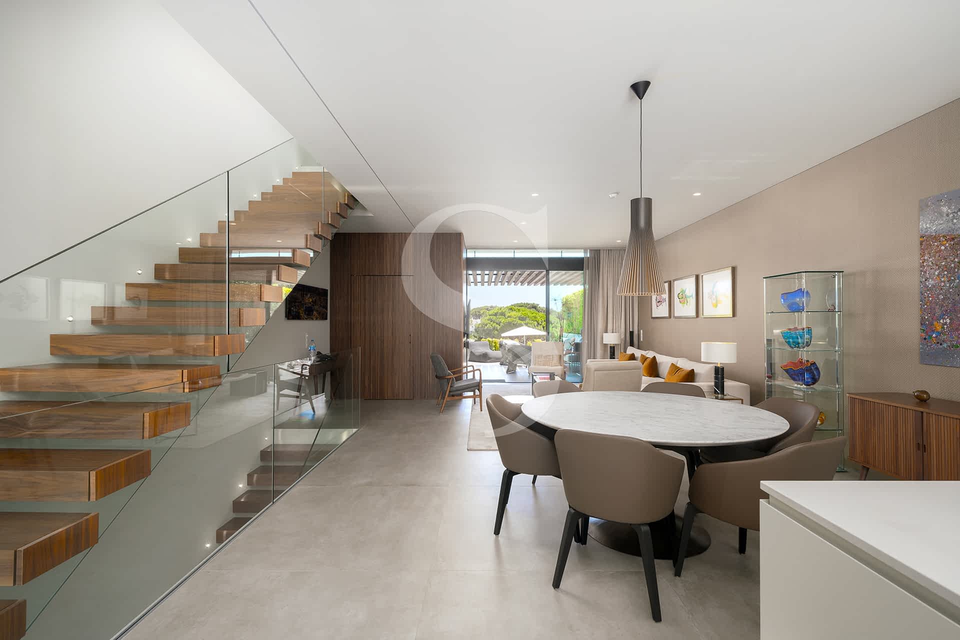 The ground floor embraces open-plan living, where a sleek, fully equipped kitchen with island flows effortlessly into the dining and lounge areas. Expansive sliding doors connect the interior to two inviting terraces: a BBQ terrace off the kitchen for relaxed alfresco dining, and a lounge terrace with direct access to the private swimming pool and landscaped garden.