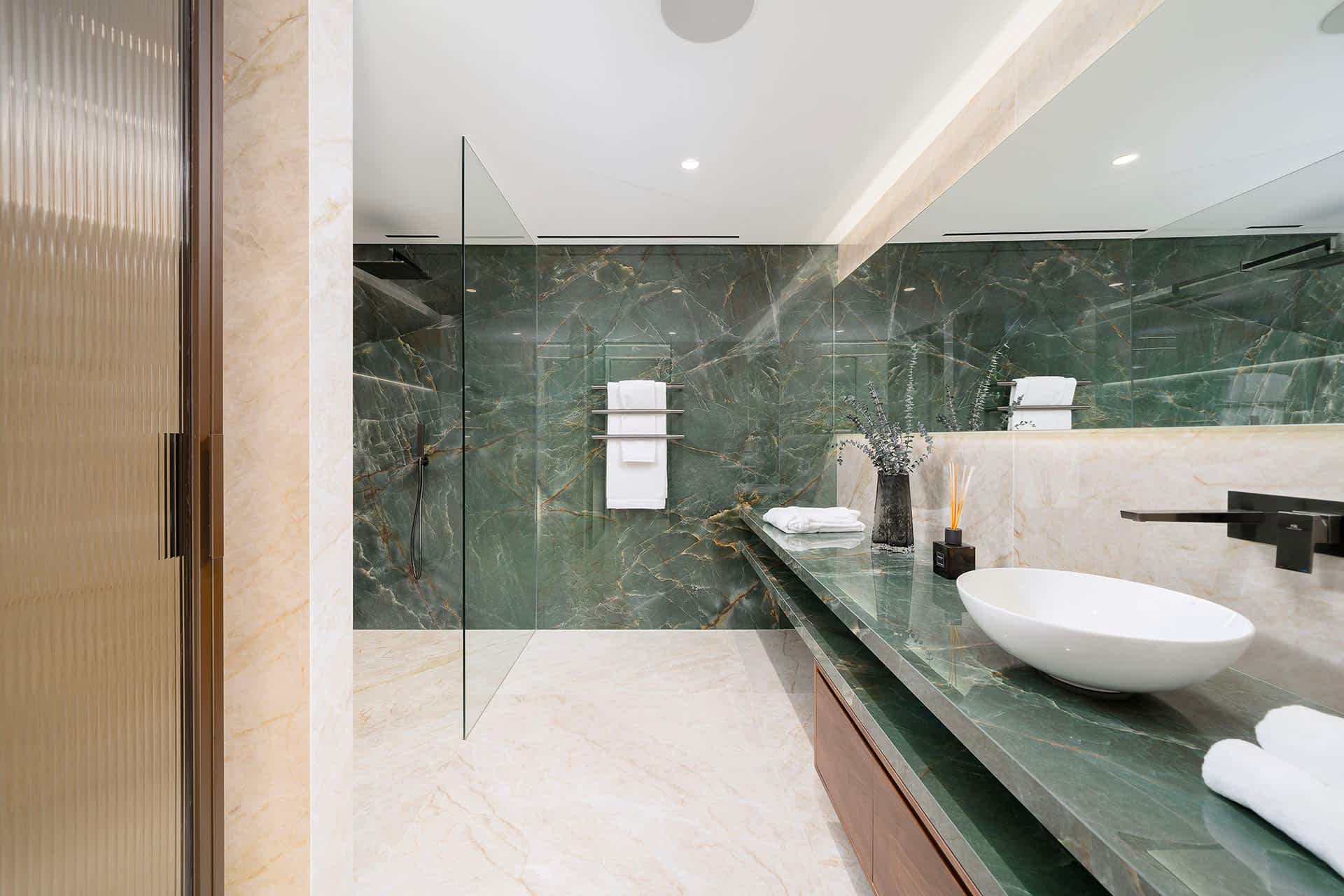 The open-plan living and dining areas, complete with a feature fireplace and showcase staircase, create a sophisticated yet inviting atmosphere for everyday living and effortless entertaining. The gourmet kitchen enjoys its own sea view, while two ground-floor guest suites offer direct garden access.