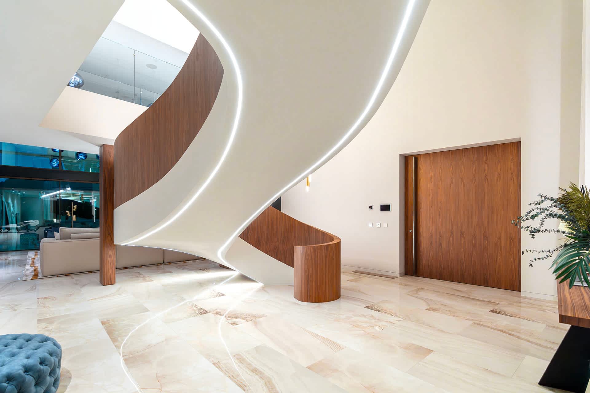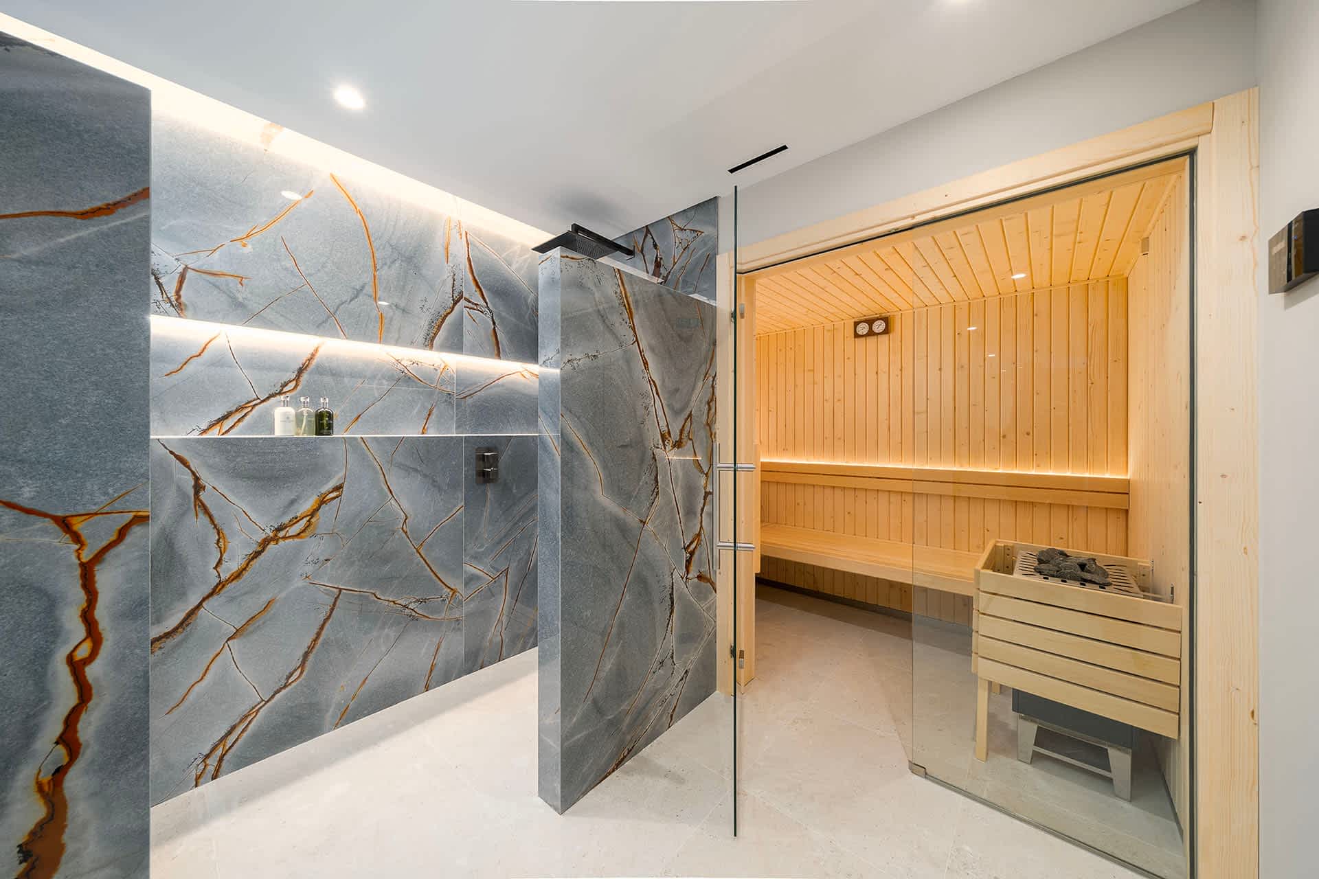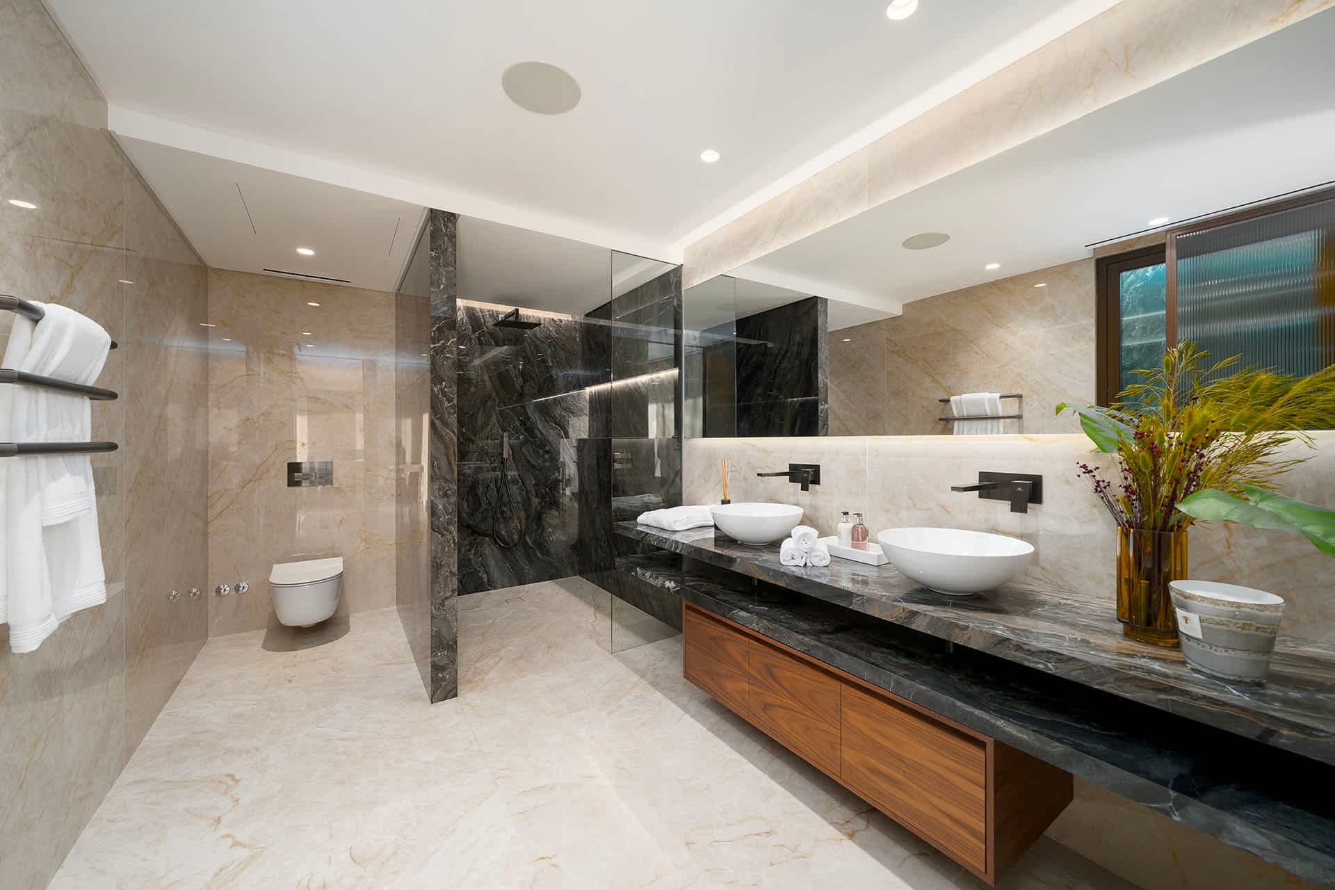 Upstairs, the palatial master suite redefines luxury with two private bathrooms, a dressing area, an outdoor shower, and a vast private terrace. A further guest suite on this floor features its own sun terrace.