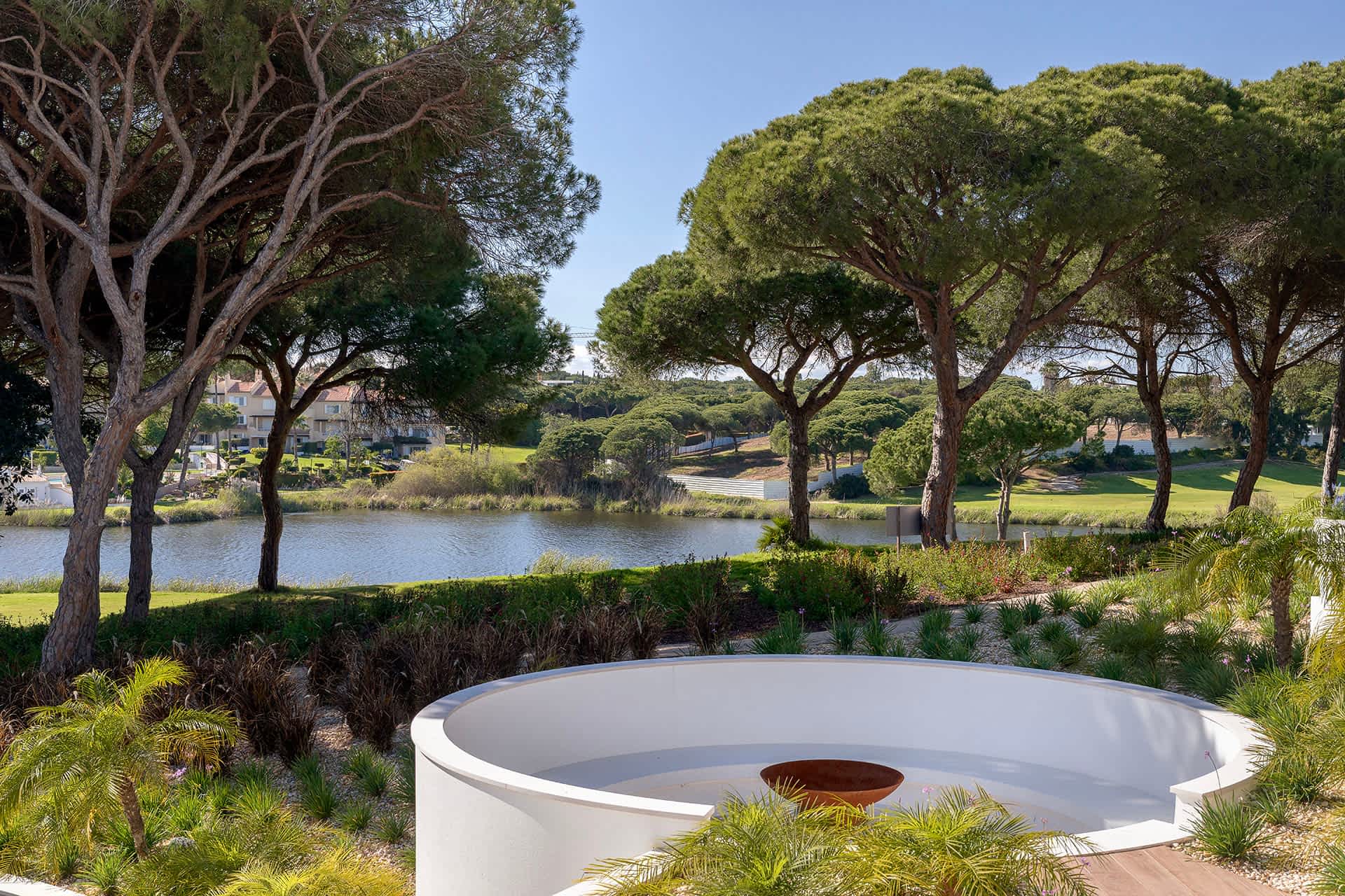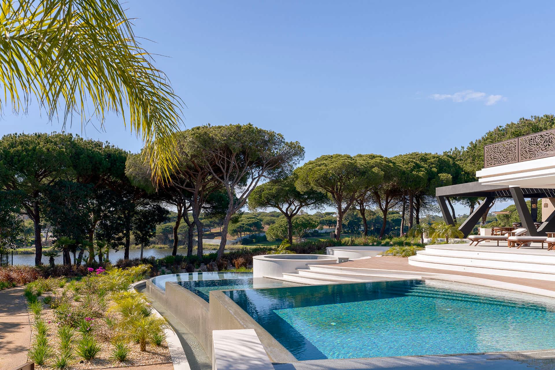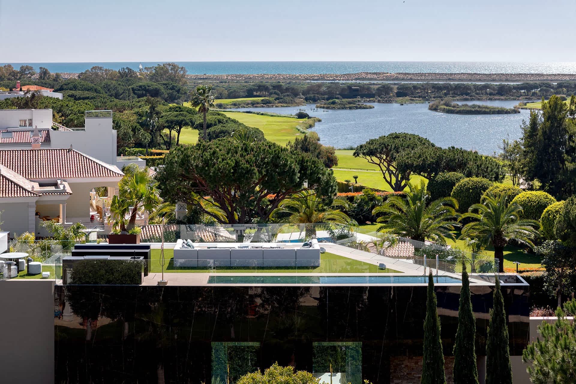 Meticulously designed with state-of-the-art finishes, the home is framed by landscaped gardens and an exquisite swimming pool, with vistas stretching across the São Lourenço golf course, serene lake, and sparkling sea.