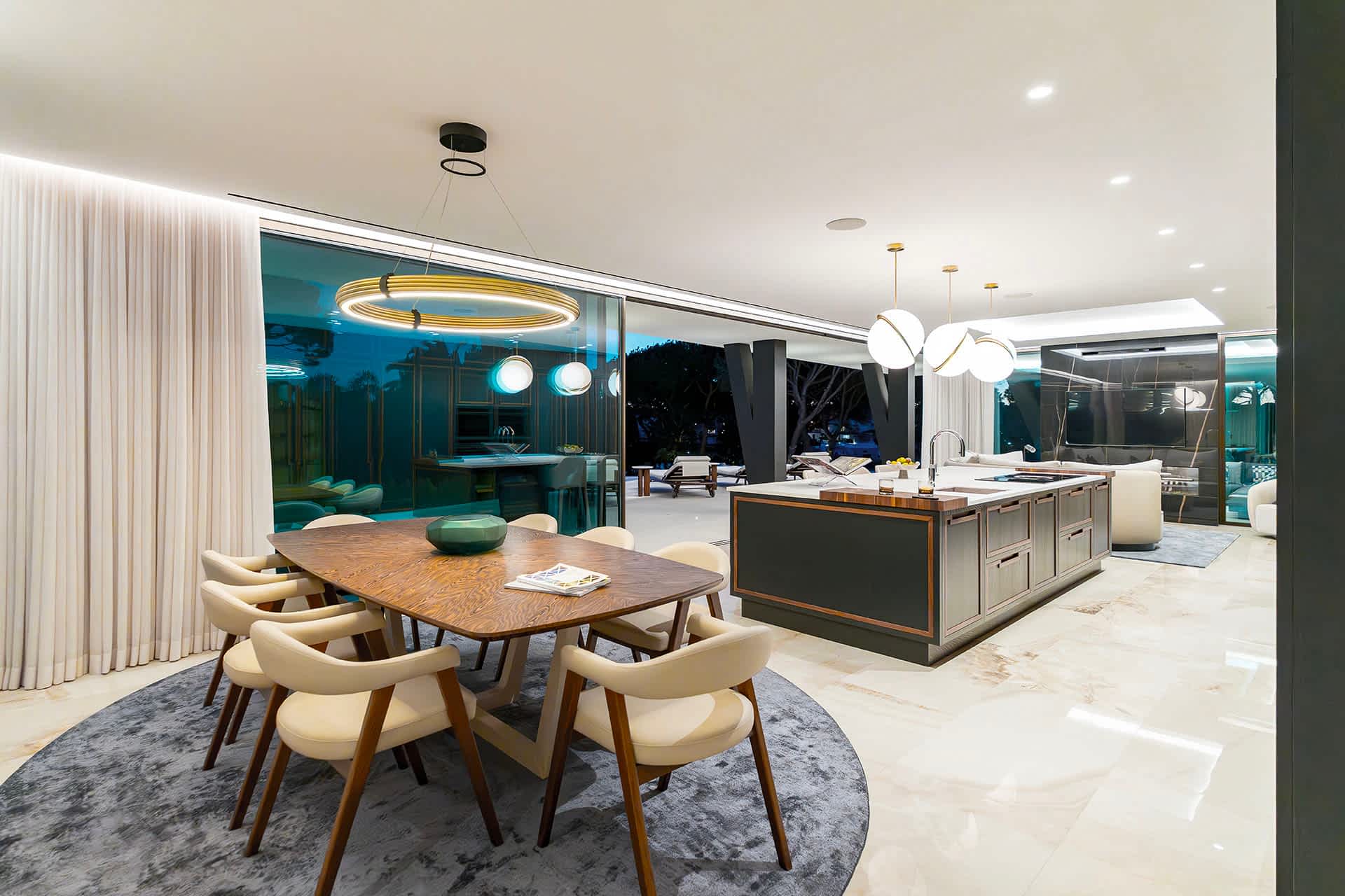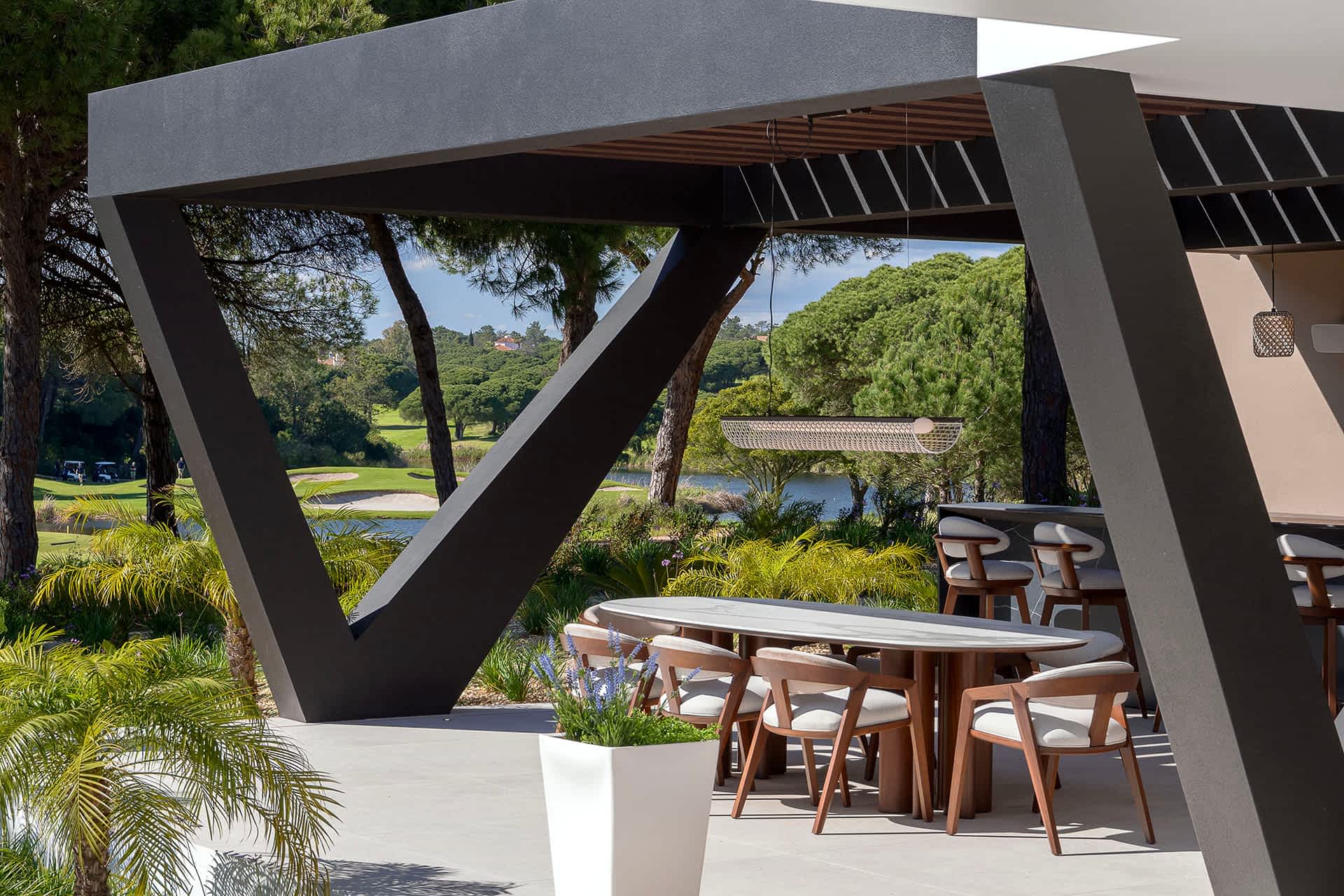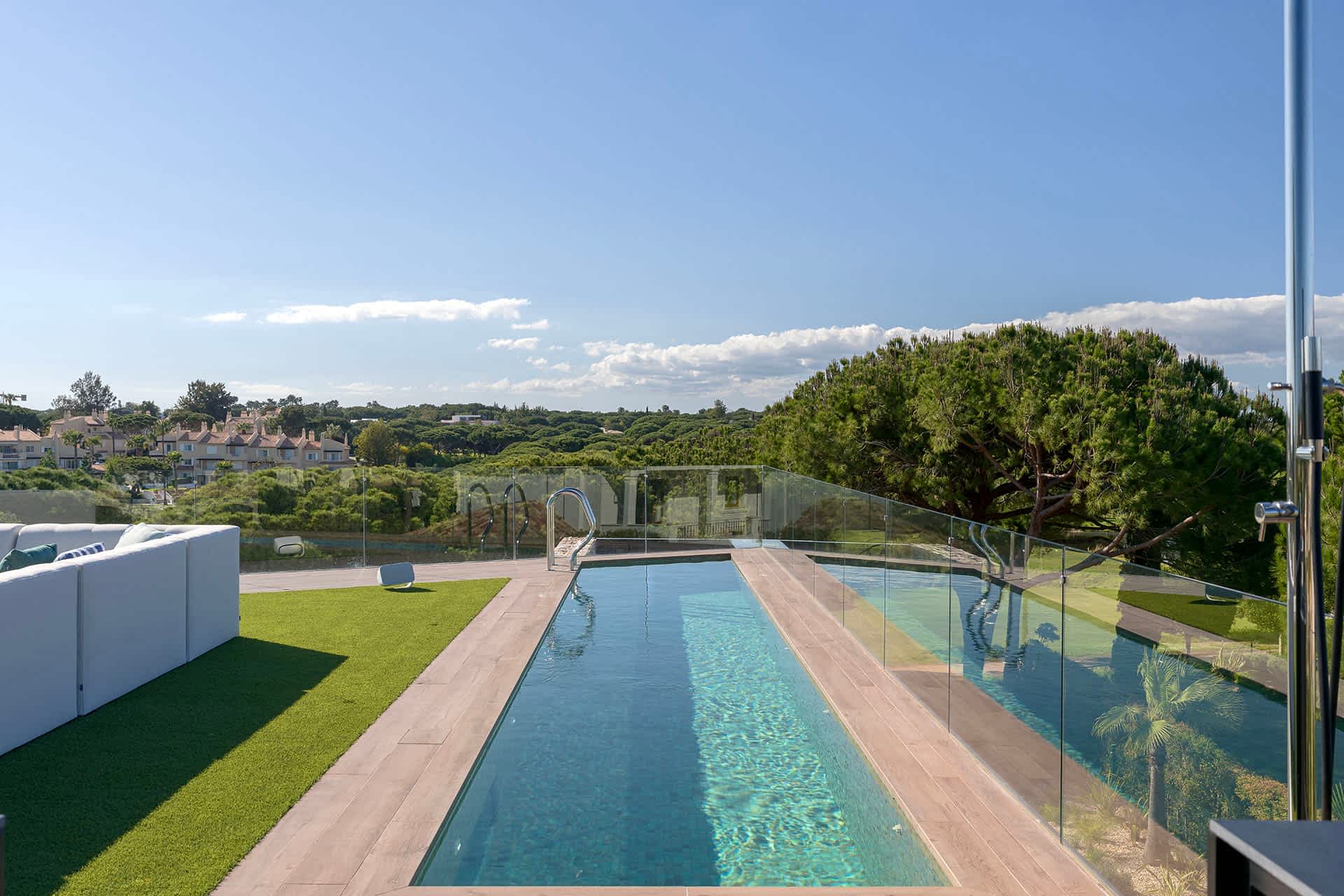 Meticulously designed with state-of-the-art finishes, the home is framed by landscaped gardens and an exquisite swimming pool, with vistas stretching across the São Lourenço golf course, serene lake, and sparkling sea.