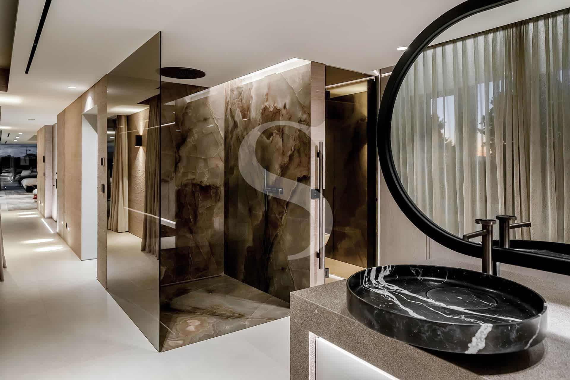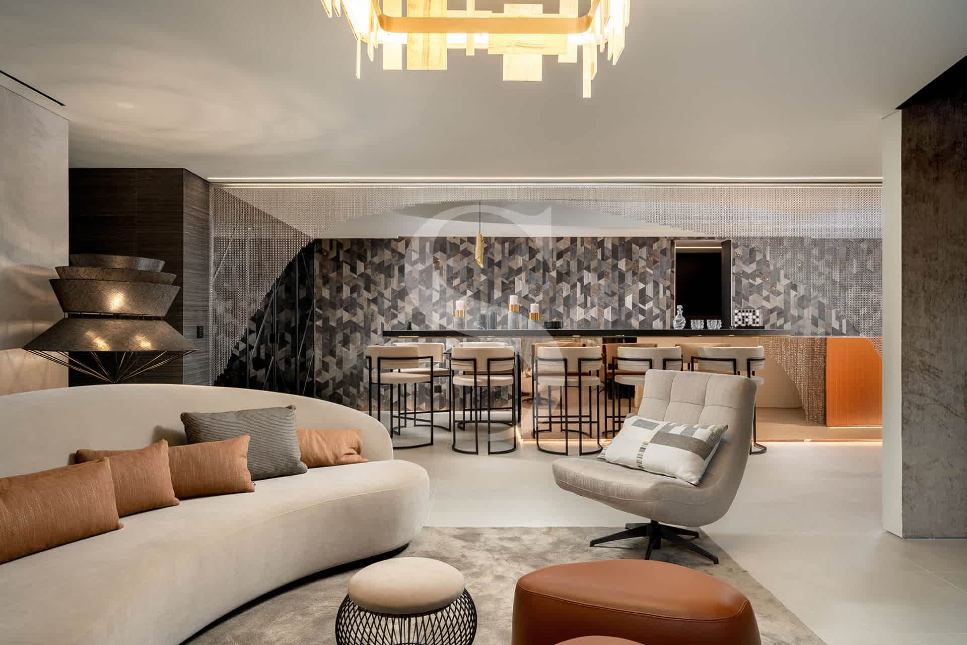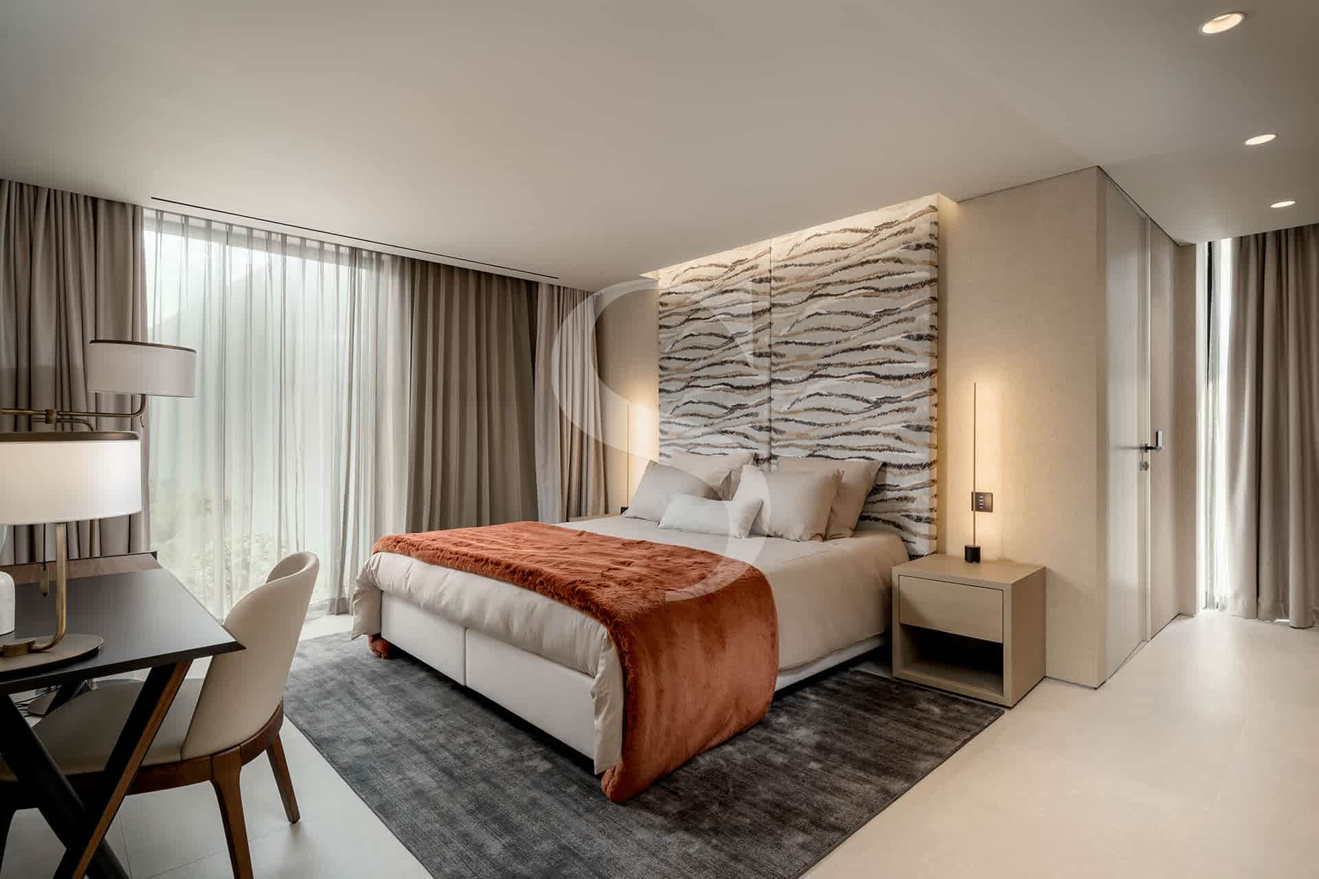 Set on an elevated plot, the villa enjoys breathtaking views of the lake, golf course, and the Atlantic Ocean. Retractable glass walls create a seamless flow between the elegant interiors and expansive alfresco areas, where you can soak in the beauty of the Algarve’s natural surroundings. The villa’s exquisite natural stone finishes add a timeless elegance, perfectly complementing the contemporary design and creating a harmonious connection to its environment.