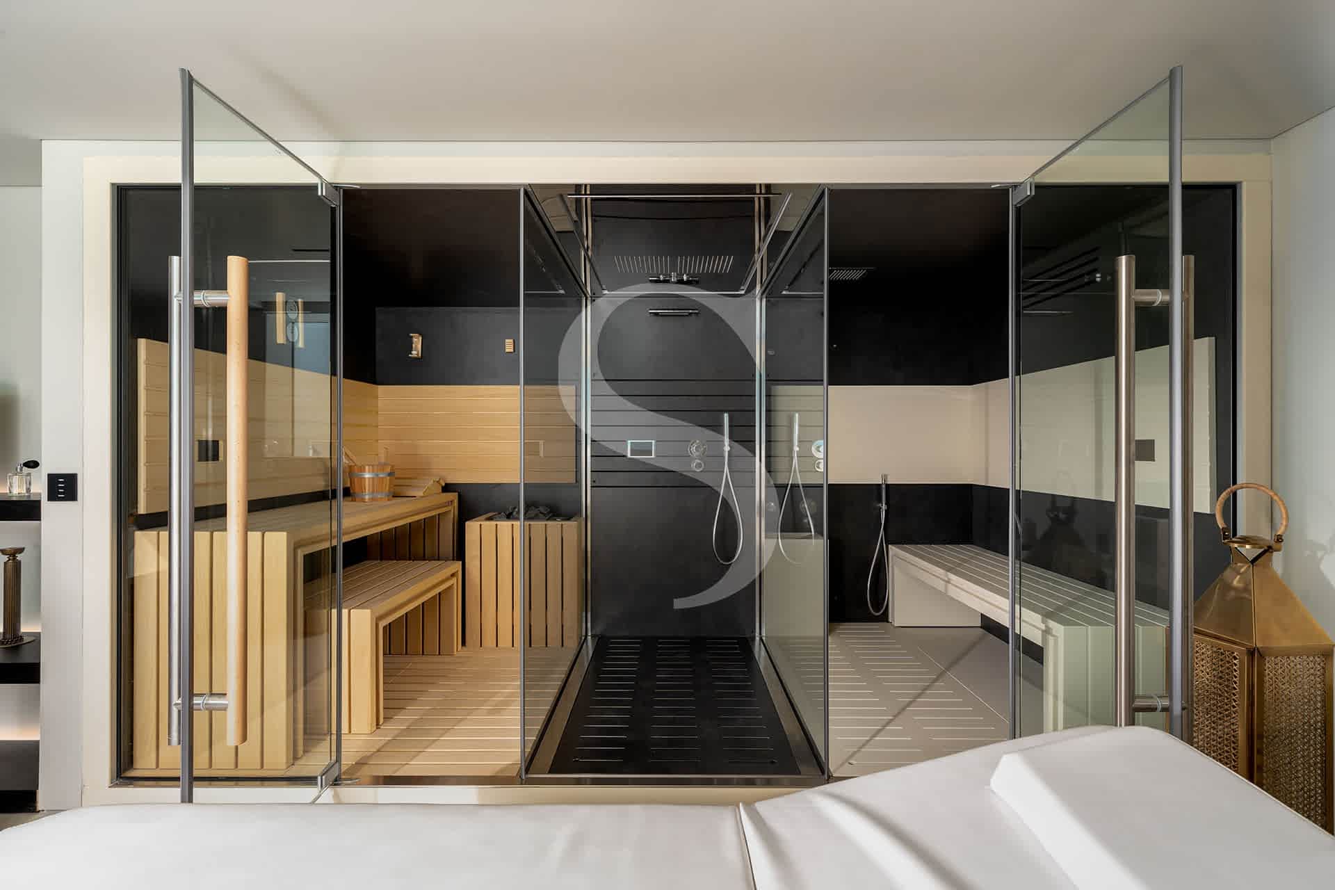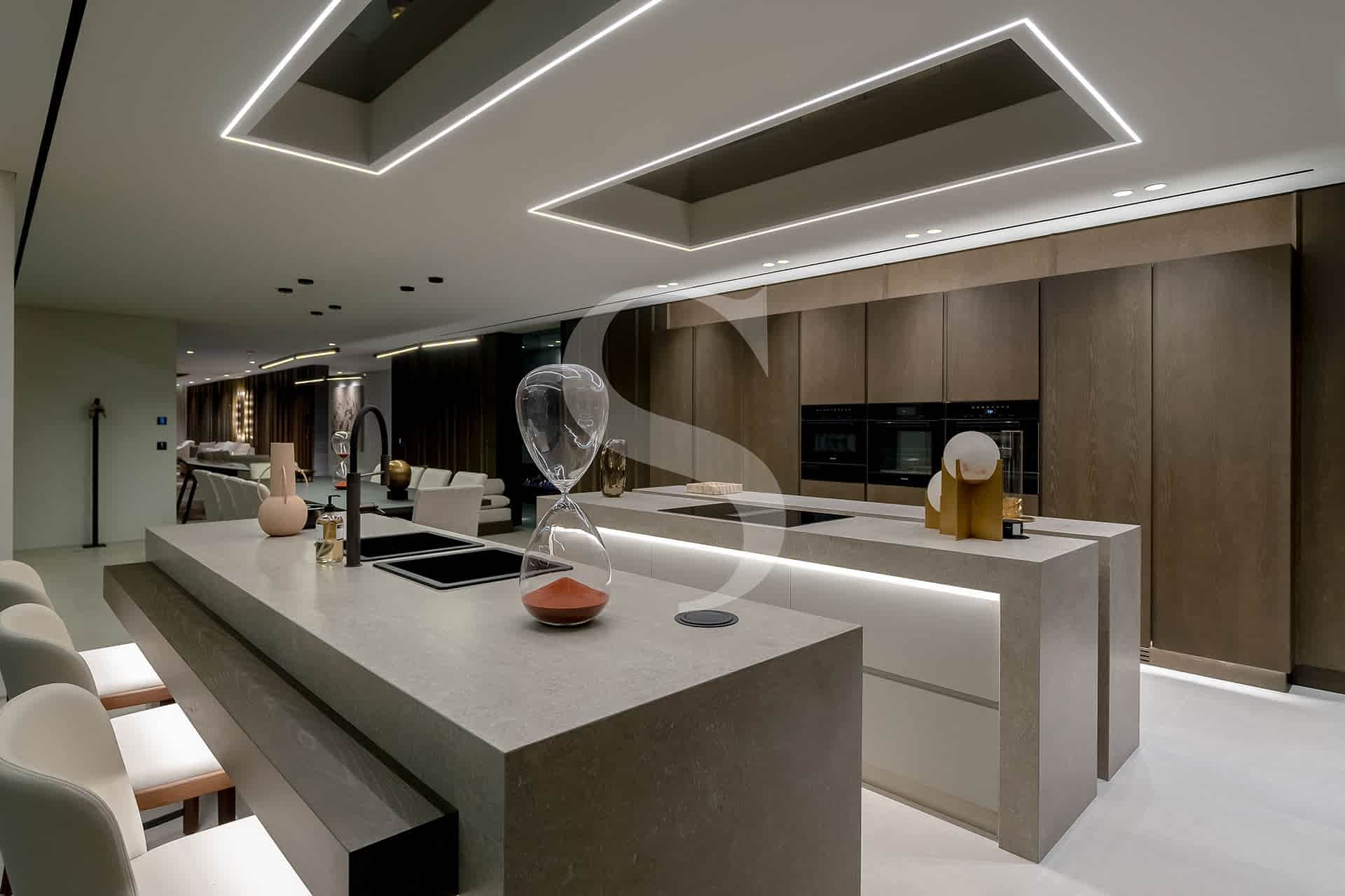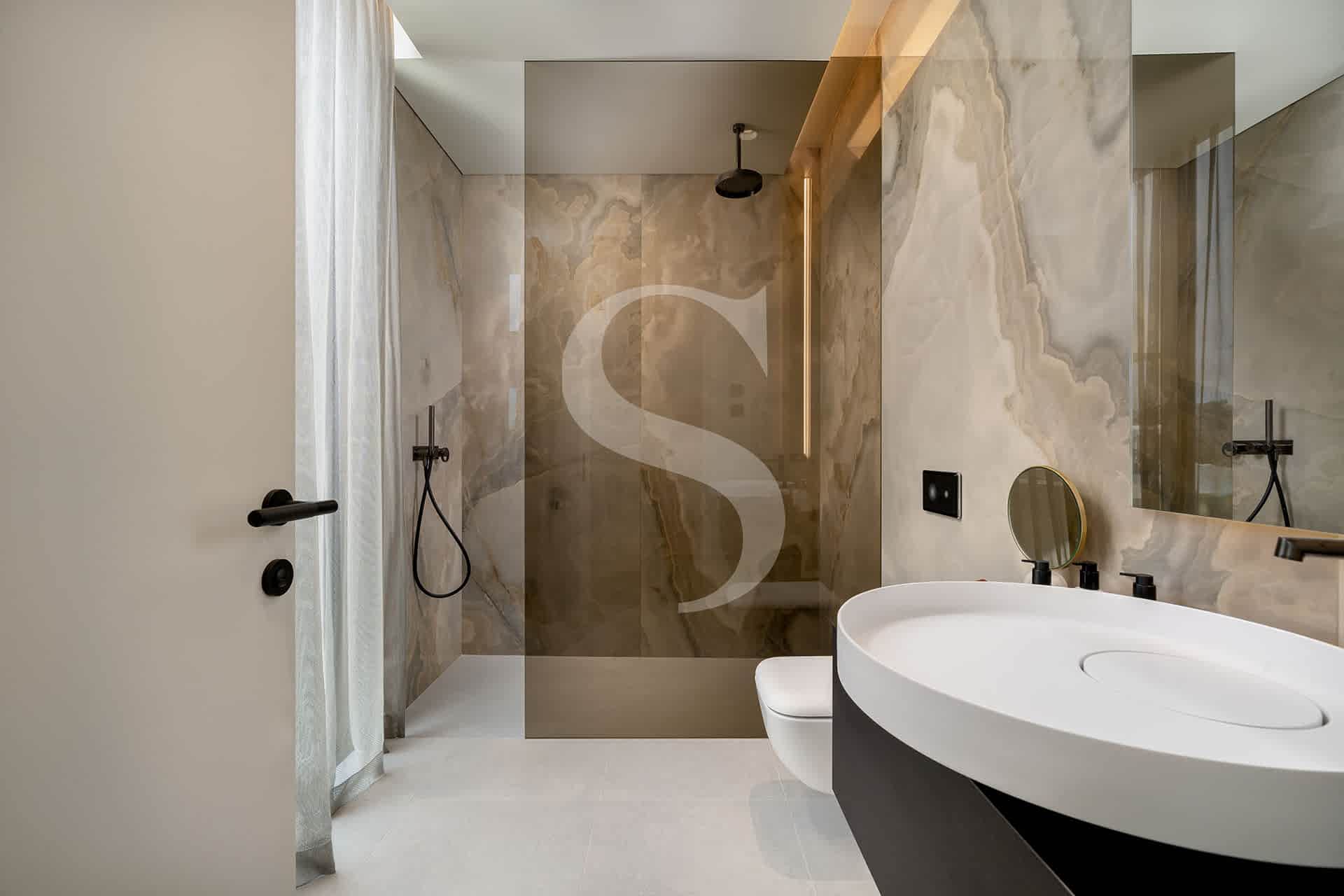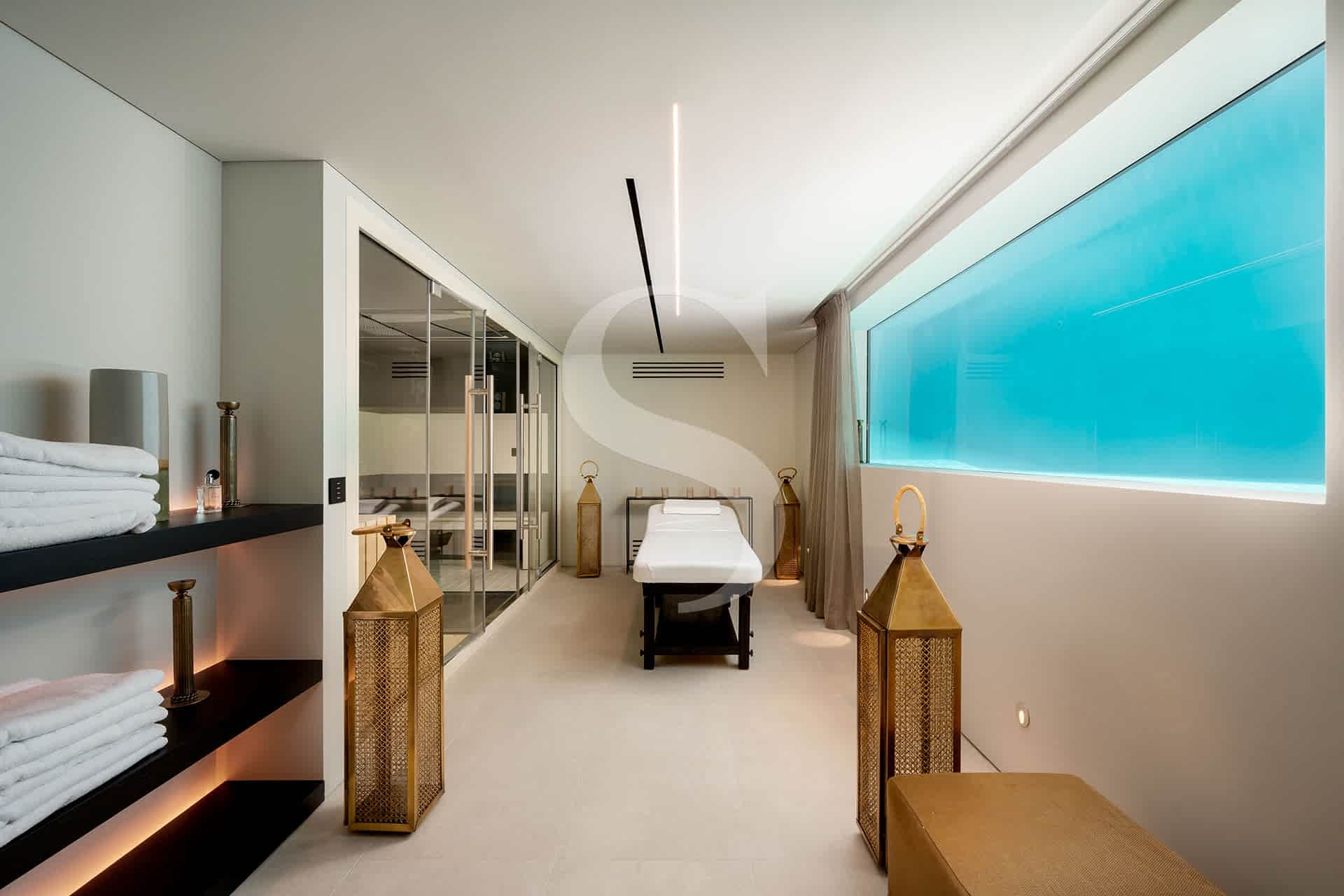 Set on an elevated plot, the villa enjoys breathtaking views of the lake, golf course, and the Atlantic Ocean. Retractable glass walls create a seamless flow between the elegant interiors and expansive alfresco areas, where you can soak in the beauty of the Algarve’s natural surroundings. The villa’s exquisite natural stone finishes add a timeless elegance, perfectly complementing the contemporary design and creating a harmonious connection to its environment.