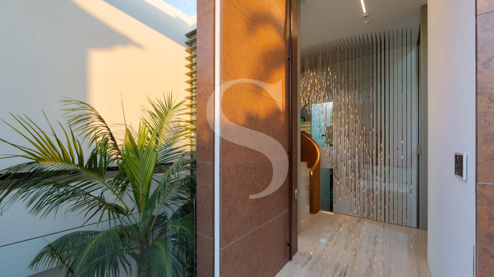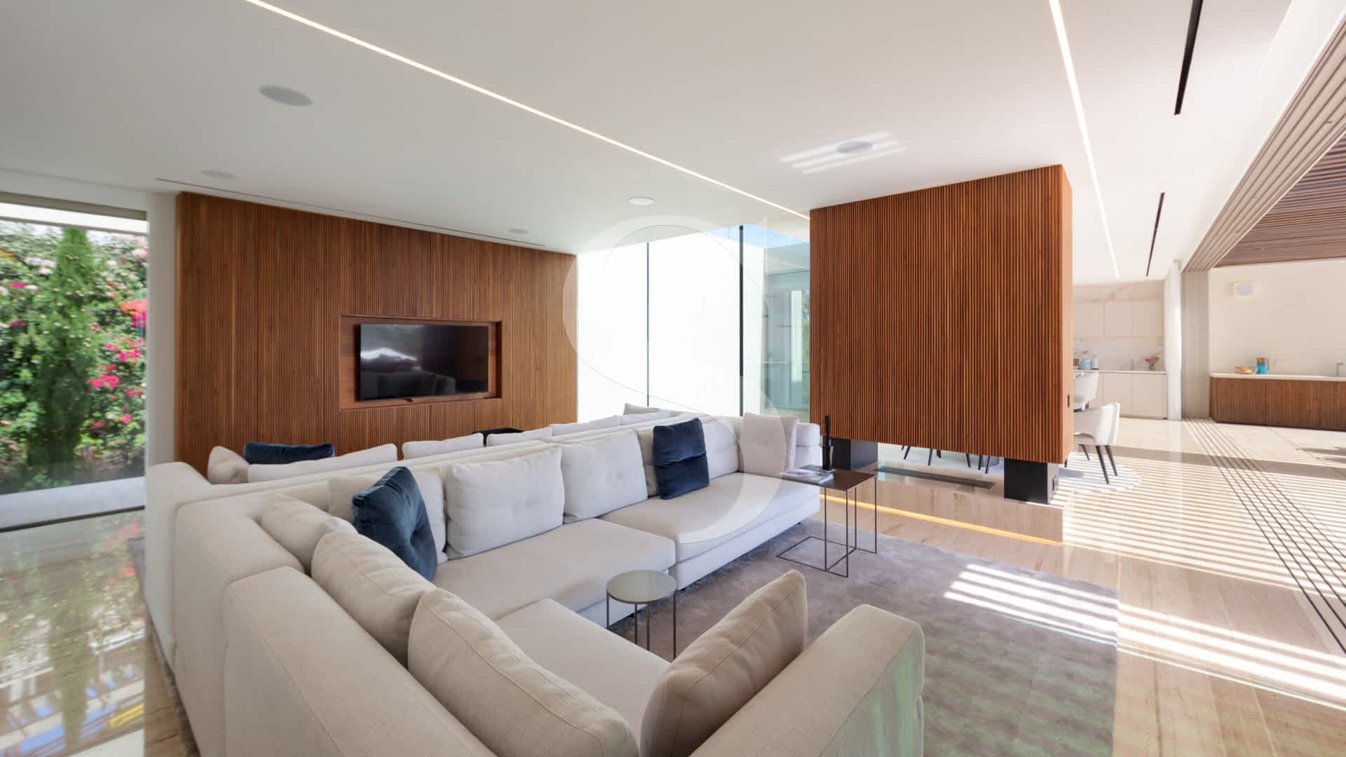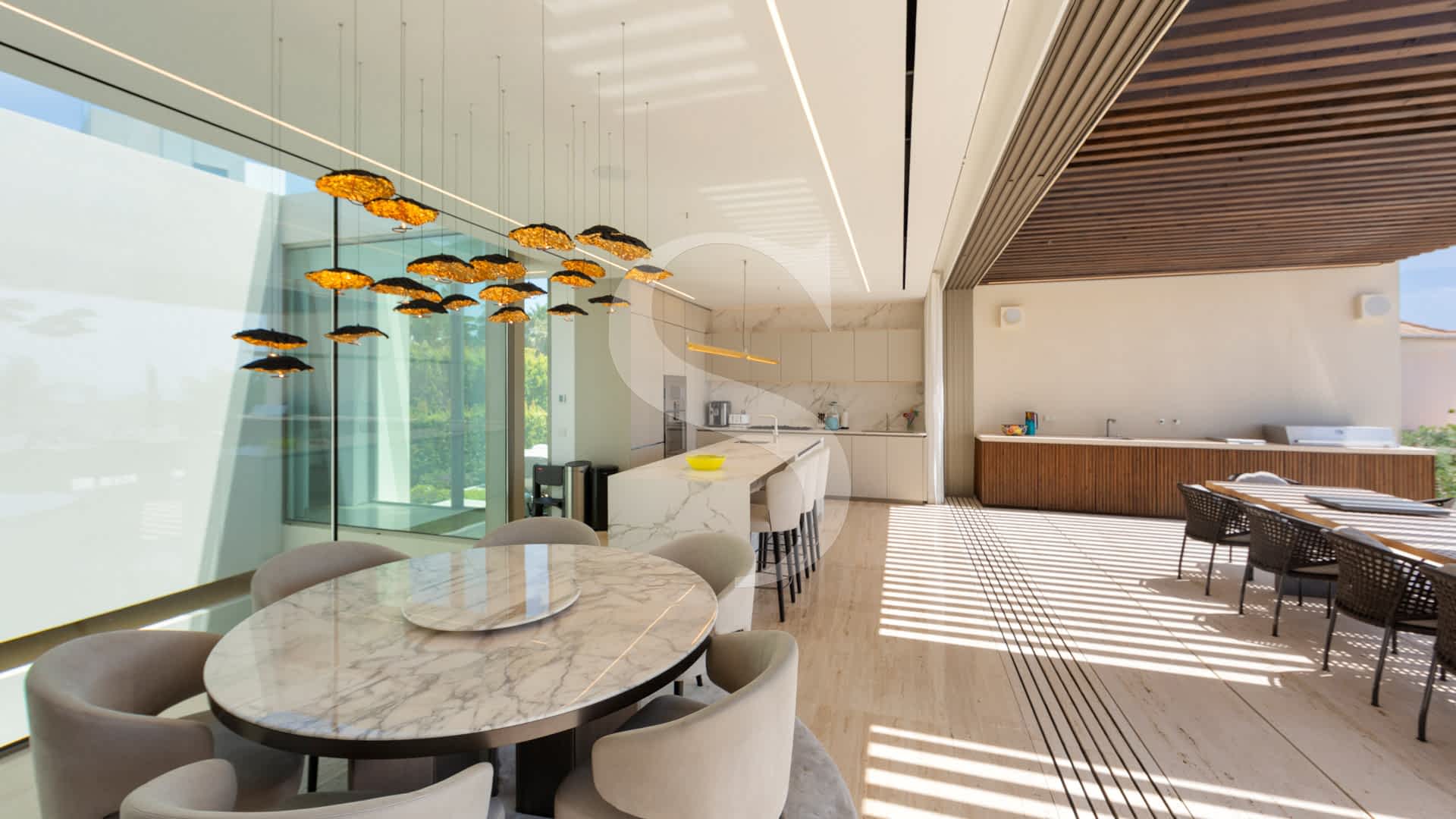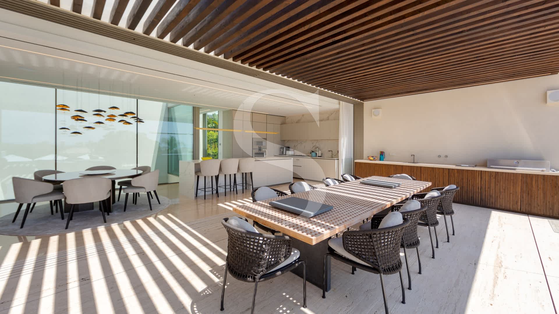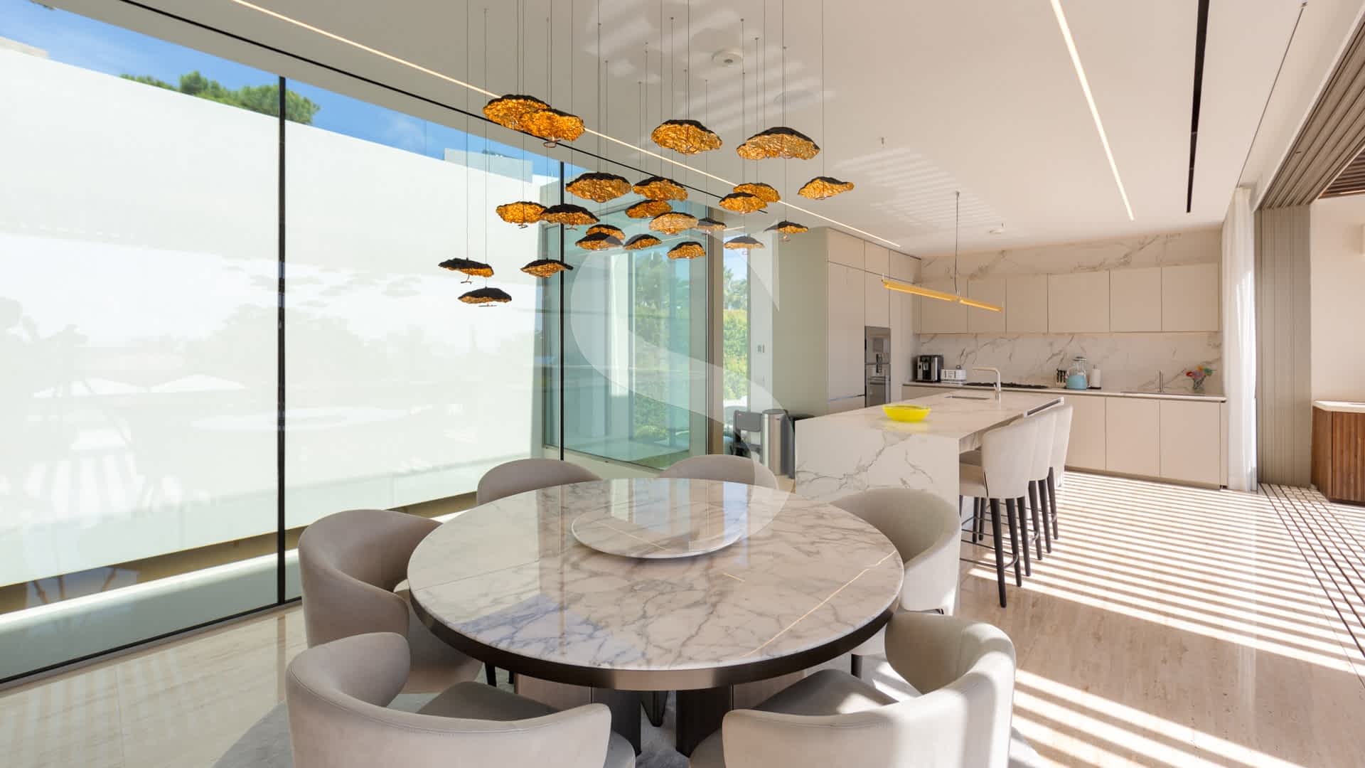 The heart of the home features an elegant double-sided fireplace, a sleek designer kitchen, and a spacious dining area, all opening onto a spectacular dining and entertaining terrace ideal for enjoying unforgettable sunsets over the sea and fairways. The master suite is a true retreat, boasting a two-level walk-in wardrobe, a spa-like bathroom with indoor and outdoor showers, and a centrepiece bed facing the ocean.