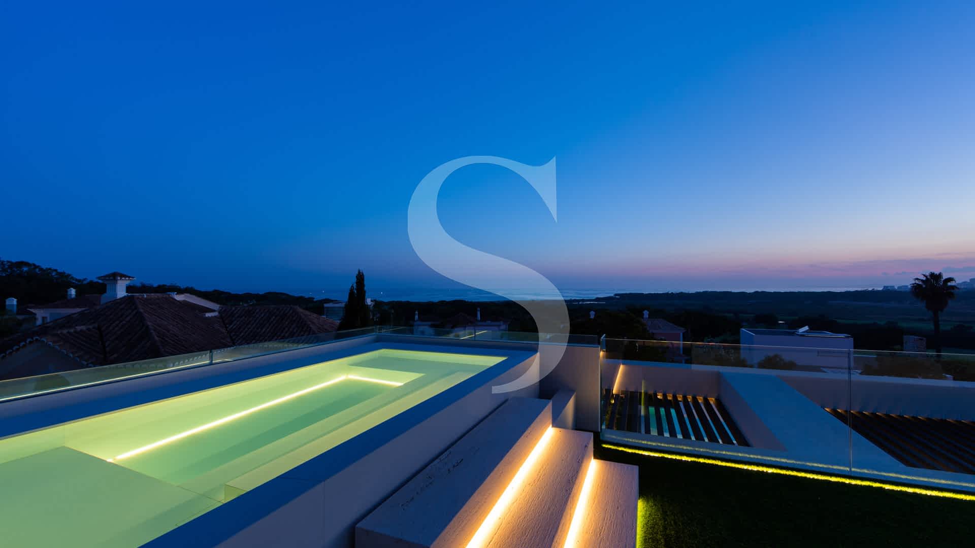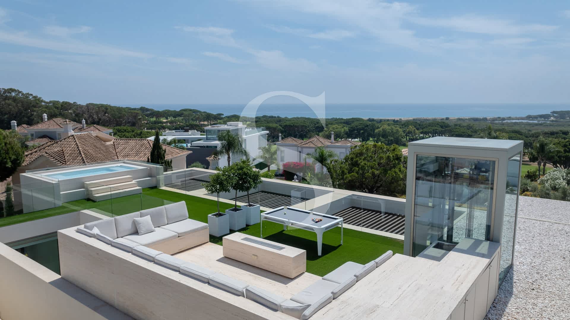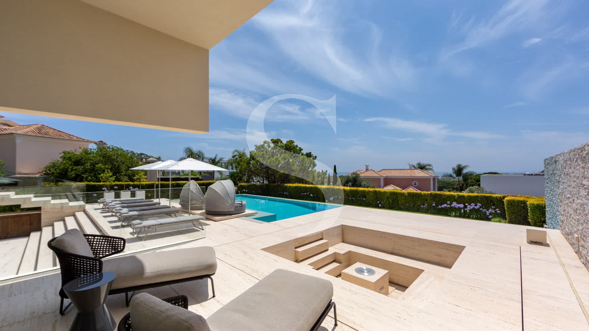 Step outside to experience exceptional outdoor living: a rooftop terrace with a plunge pool and fire-pit lounge, multiple alfresco dining areas, an expansive pool deck, and a luminous courtyard connecting the lower level with a private cinema and garage. This villa is a masterpiece of design and comfort, just minutes on foot from Vale do Lobo’s exclusive beaches, golf courses, fine dining, and leisure facilities.